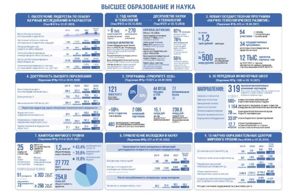 В аппарате вице-премьера сообщили ТАСС, что объем подтвержденного софинансирования федерального проекта "Передовые инженерные школы" высокотехнологичными компаниями превысил плановые значения более чем на 50% и составил 12,7 млрд рублей). По поручению президента началось строительство сети университетских кампусов мирового уровня. К 2030 году должно появиться 25 студгородков, которые объединят в себе места проживания, передовые лаборатории, научно-образовательные площади и досуговые пространства, бизнес-инкубаторы и технопарки. Сейчас уже стартовала реализация первых восьми 8 проектов. Общая стоимость реализации проектов составляет около 255 млрд рублей. Из федерального бюджета выделяется на строительство около 40% этой суммы. Остальное - средства регионов и частного бизнеса.