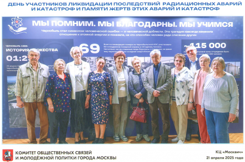 21 апреля 2025 года Департамент культуры г. Москвы, дирекция массовых мероприятий и Комитет общественных связей и молодёжной политики г. Москвы организовали в КЦ «Москвич» торжественный вечер в честь «Дня участников ликвидации последствий радиационных аварий и катастроф и памяти жертв этих аварий и катастроф». На мероприятие были приглашены москвичи – участники ликвидации последствий катастрофы на Чернобыльской АЭС.