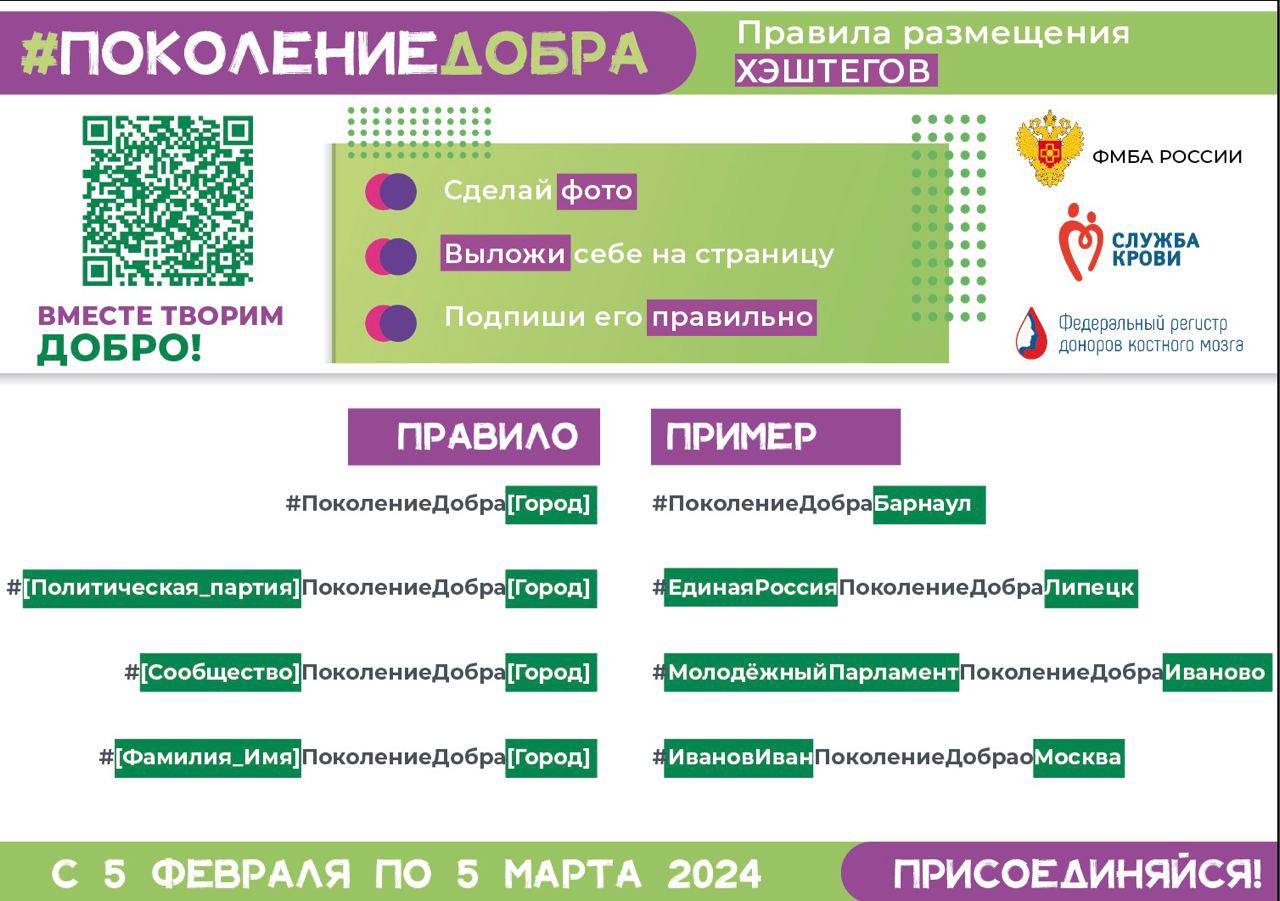 С 5 февраля по 5 марта при поддержке Федерального медико-биологического агентства во всех регионах страны пройдет Всероссийская акция «Поколение добра».