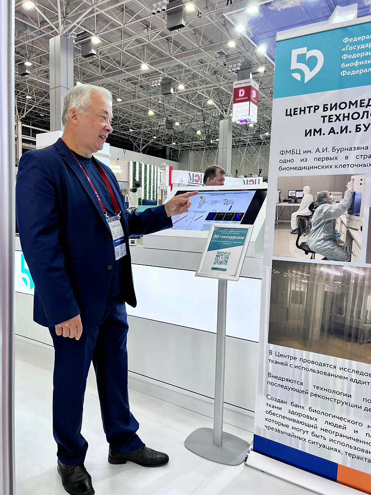 На стенде ФМБЦ им. А.И. Бурназяна находятся презентационные материалы о работе Центра биомедицинских и аддитивных технологий, который в апреле этого года одним из первых в России получил лицензию на производство биомедицинских клеточных продуктов. В данный момент специалисты центра проводят разработки в области восстановления различных повреждений кожи и ее придатков, травмированных тканей, связок и суставного хряща с применением технологий 3D-биопринтинга, биомедицинских клеточных продуктов. Ими также создан банк биологического материала, включающий стволовые клетки и ткани здоровых людей и пациентов с различными заболеваниями, обеспечивающий неограниченно долгое сохранение активных живых стволовых клеток, которые могут быть применены в случае лечения пострадавших в чрезвычайных ситуациях, актах терроризма, техногенных авариях.
