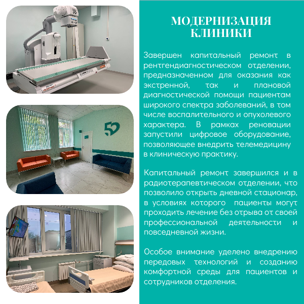 Большая работа проведена по модернизации клинических подразделений: капитальный ремонт завершили в рентгендиагностическом и радиотерапевтическом отделениях, а также в магнитно-резонансной томографии.