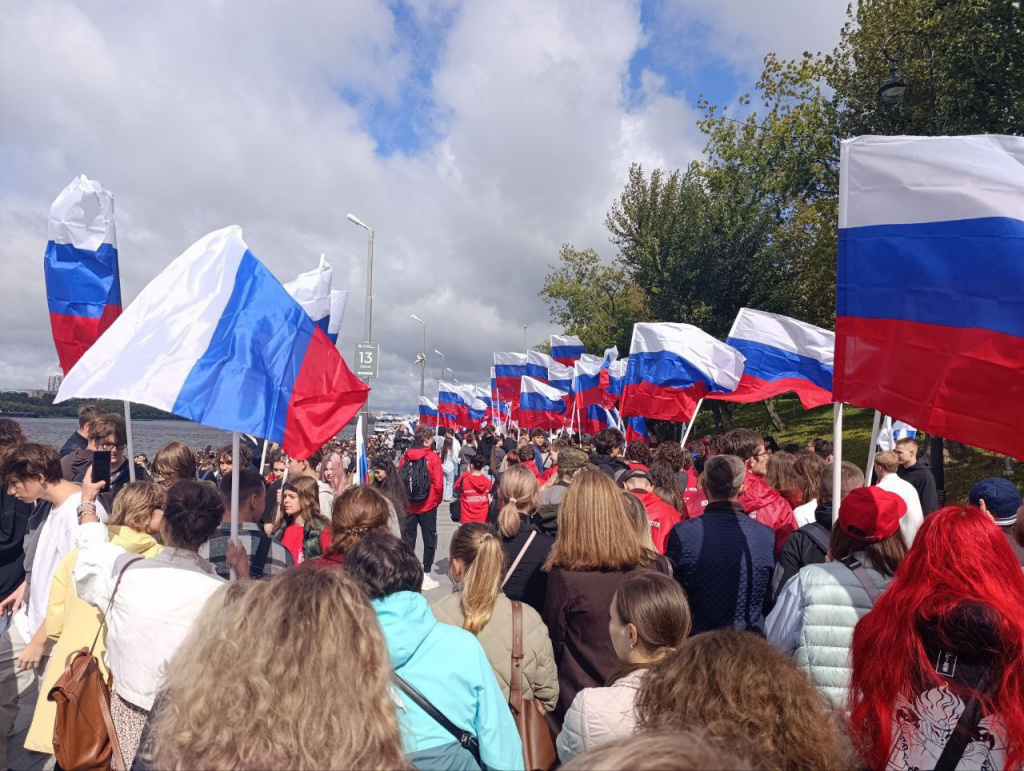 Колонна, состоявшая из тысяч активных людей – представителей молодежных организаций, студенческих объединений и волонтерских движений, - прошла по набережной, развивая российский флаг – символ национальной гордости и исторических традиций.