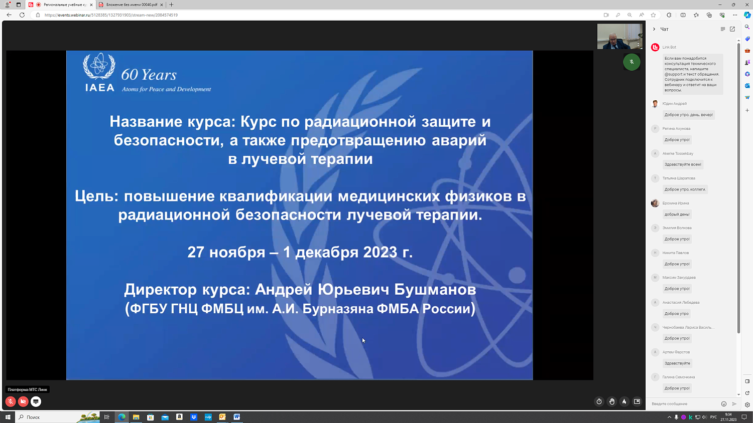 В период с 27 ноября по 1 декабря 2023 года на базе ФГБУ ГНЦ ФМБЦ им. А.И. Бурназяна ФМБА России в онлайн-формате прошел Региональный учебный курс МАГАТЭ по радиационной защите и безопасности, а также предотвращению аварий в лучевой терапии» в рамках реализации Программы действий Международного агентства по атомной энергии по лечению рака.