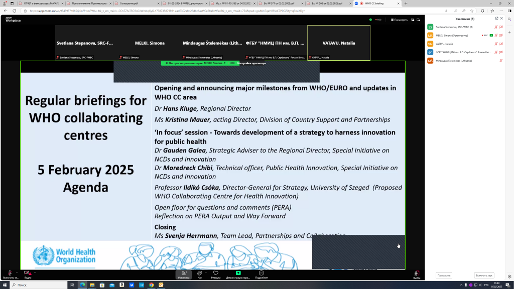 Согласно повестке совещания были представлены новые сотрудничающие центры ВОЗ, а также предстоящие мероприятия в рамках подготовки второго Европейского плана работы ВОЗ на следующие несколько лет. В 2025 году девизом ВОЗ станет «Здравоохранение для всех независимо от того, откуда родом человек».