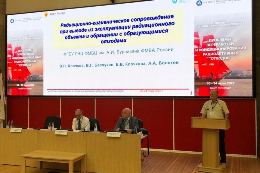 Наш Центр на семинаре представлял главный научный сотрудник ФМБЦ им. А.И. Бурназяна, доктор технических наук Владимир Николаевич Клочков. Он выступил с докладом «Радиационно-гигиеническое сопровождение при выводе из эксплуатации радиационного объекта и обращении с образующимися отходами», подготовленным специалистами Лаборатории радиационной безопасности персонала Отдела промышленной радиационной гигиены.