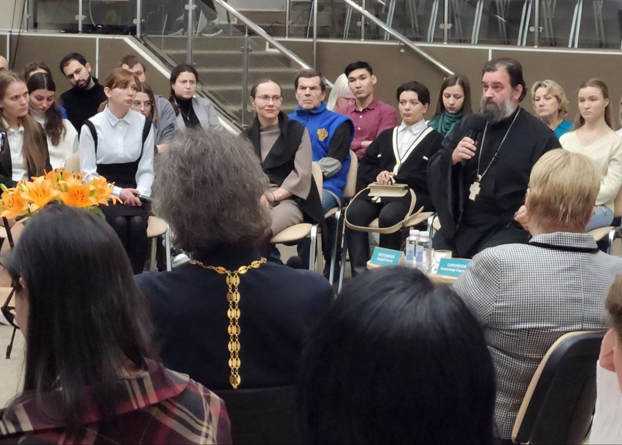 Отец Андрей Ткачев – известный проповедник, ведущий телепрограмм, писатель и один из самых узнаваемых священнослужителей Русской православной Церкви. В своем выступлении он рассуждал о роли церкви в науке и медицине и важности духовно-нравственного воспитания личности.