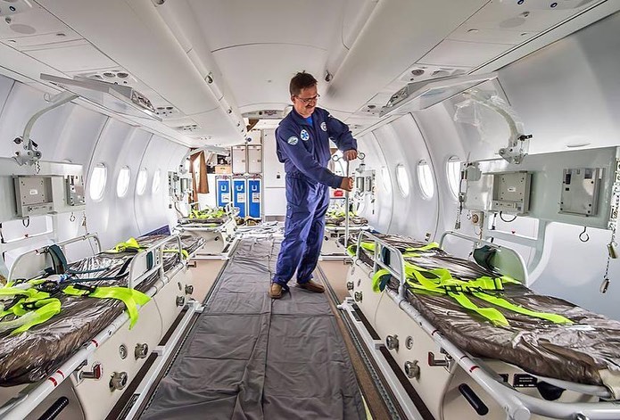 Салон самолета имеет три модульных варианта медицинской комплектации и предназначен для эвакуации граждан, нуждающихся в срочной медицинской помощи, из труднодоступных мест и с территорий зарубежных государств.
