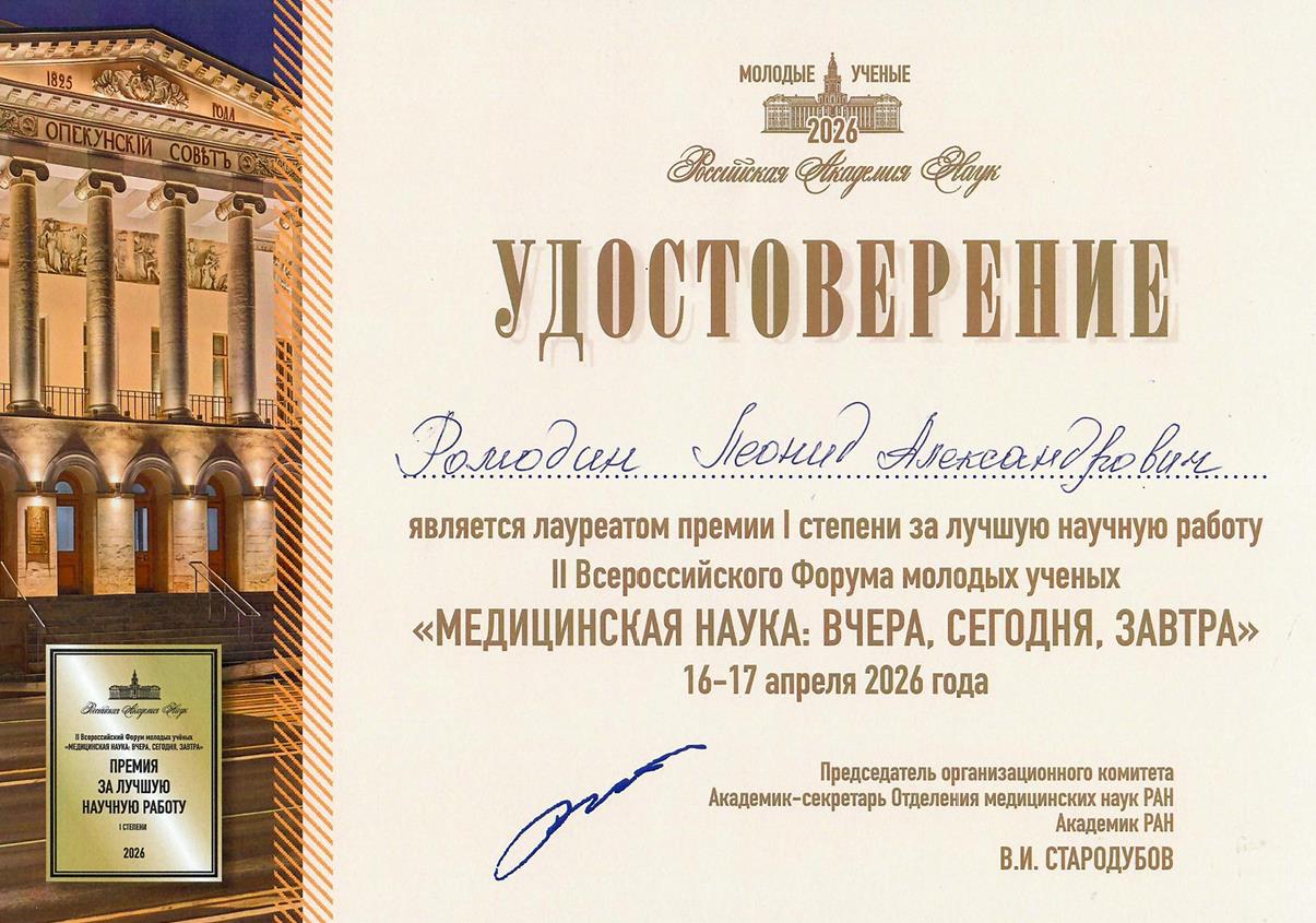 16–17 апреля 2026 года проходил II Всероссийский Форум молодых учёных «Медицинская наука: вчера, сегодня, завтра», главным организатором которого являлась Российская академия наук. Данное мероприятие является значимой площадкой для консолидации научного сообщества и демонстрации достижений молодых исследователей в области медицины и смежных дисциплин. Целью форума было повышение исследовательской активности и мотивации молодых учёных, расширение научных связей, формирование опыта публичных выступлений и представление возможностей для презентации результатов своей работы. В рамках работы форума параллельно проходили 22 тематические секции, посвящённые различным направлениям медико-биологической науки.