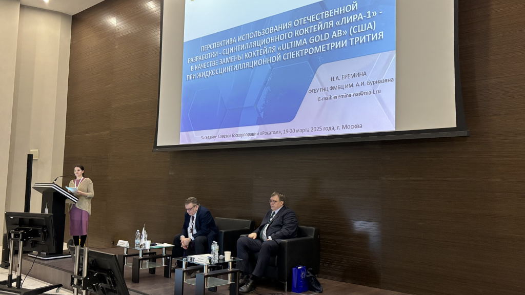 По результатам "Ильинских чтений - 2025", начальником отдела Генеральной инспекции Госкорпорации "Росатом" Романовым Владимиром Васильевичем на заседании Совета была приглашена младший научный сотрудник лаборатории 22 Еремина Наталья Александровна. Она представила доклад о перспективах использования отечественной разработки - сцинтилляционного коктейля «ЛИРА-1» — в качестве замены коктейля «Ultima Gold AB» (США) при жидкосцинтилляционной спектрометрии трития. Доклад вызвал живой интерес участников заседания.