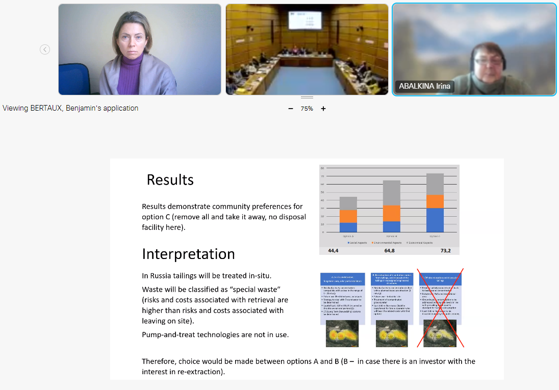 ФГБУ ГНЦ ФМБЦ им. А.И. Бурназяна ФМБА России в режиме видеоконференции представляли заведующий Лабораторией регулирующего надзора за объектами ядерного наследия, кандидат биологических наук Сергей Михайлович Киселев и ведущий научный сотрудник кандидат биологических наук Юлия Николаевна Зозуль, как специалисты, разрабатывающие вопросы эколого-гигиенического мониторинга на территориях расположения радиационно-опасных объектов.