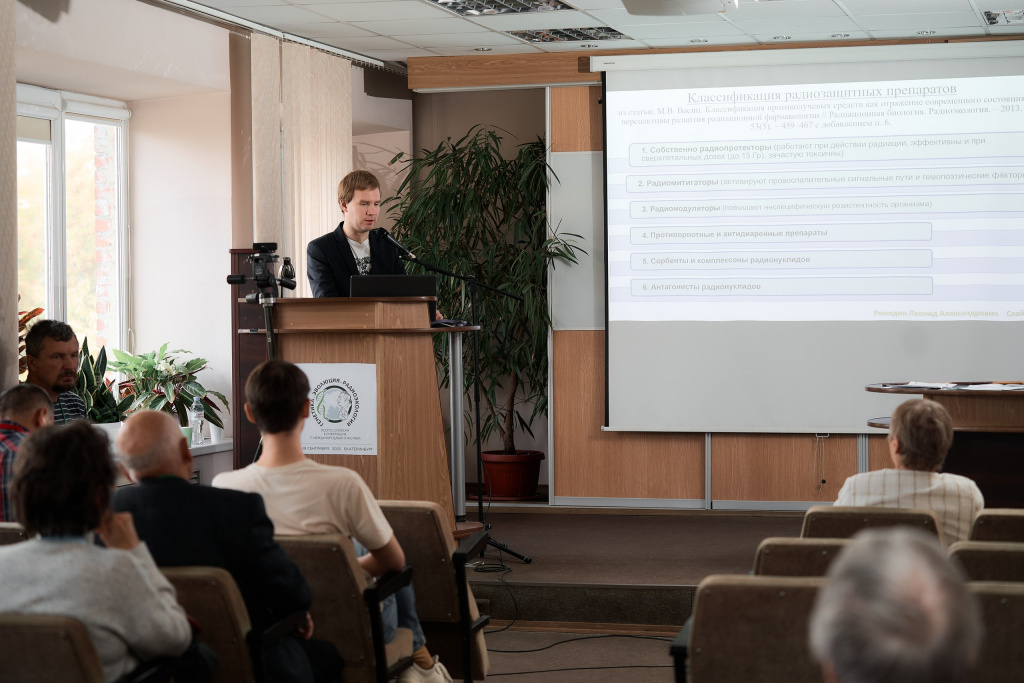 На конференции были представлены результаты работ, проведённых на базе ГНЦ ФМБЦ имени А.И. Бурназяна ФМБА России в рамках выполнения проекта Российского научного фонда № 23-24-00383 «Перспективные радиозащитные препараты при внешнем облучении». Руководитель проекта, Леонид Александрович Ромодин, в докладе «Оценка противолучевой эффективности ряда схем совместного использования нескольких препаратов при облучении мышей в дозе 6,5 Гр» представил результаты разработки новых схем профилактики и лечения лучевой болезни. Сущность данного подхода заключается в использовании радиозащитных препаратов с различным механизмом действия, используемых в различные периоды лучевой болезни так, чтобы каждый препарат влиял на конкретные звенья патогенеза лучевого поражения для максимального смягчения его тяжести. В частности, описанная в докладе схема, подразумевающая введение до облучения фенилэфрина и после облучения – глутатиона, витамина E и пэгфилграстима, обеспечила полную выживаемость мышей, облучённых в летальной дозе.