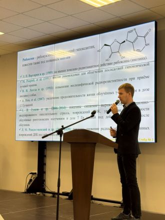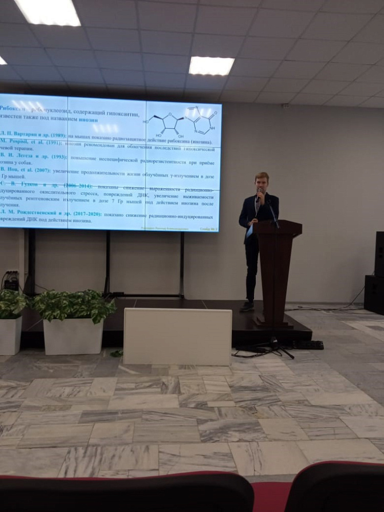 Старший научный сотрудник Леонид Александрович Ромодин в докладе «Радиомодифицирующий эффект рибоксина (инозина) при внешнем облучении мышей» представил часть результатов выполнения проекта Российского научного фонда № 23-24-00383 «Перспективные радиозащитные препараты при внешнем облучении».