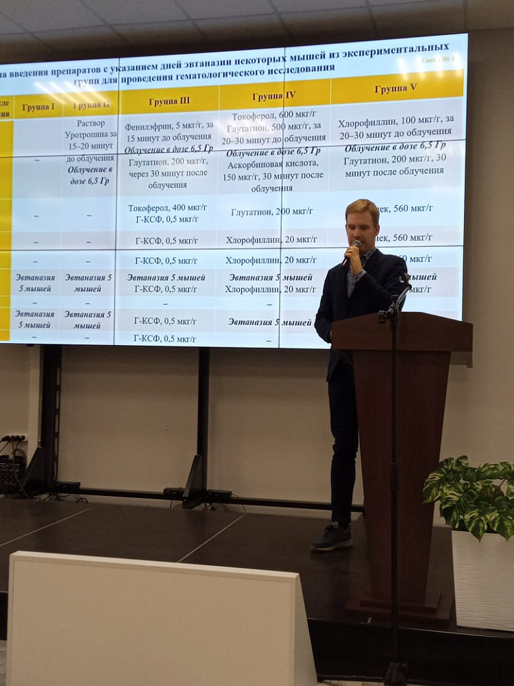 23–24 октября в городе Обнинске на базе ФГБУ «Всероссийский научно-исследовательский институт радиологии и агроэкологии Национального исследовательского центра “Курчатовский институт”» прошла III Международная молодёжная конференция «Генетические и радиационные технологии в сельском хозяйстве». На ней впервые в рамках доклада «Оценка эффективности комбинированного применения нескольких радиозащитных препаратов по изменению содержания лейкоцитов и тромбоцитов и критерию выживаемости облучённых в дозе 6,5 Гр мышей» была представлена новая схема лечения острого лучевого синдрома.