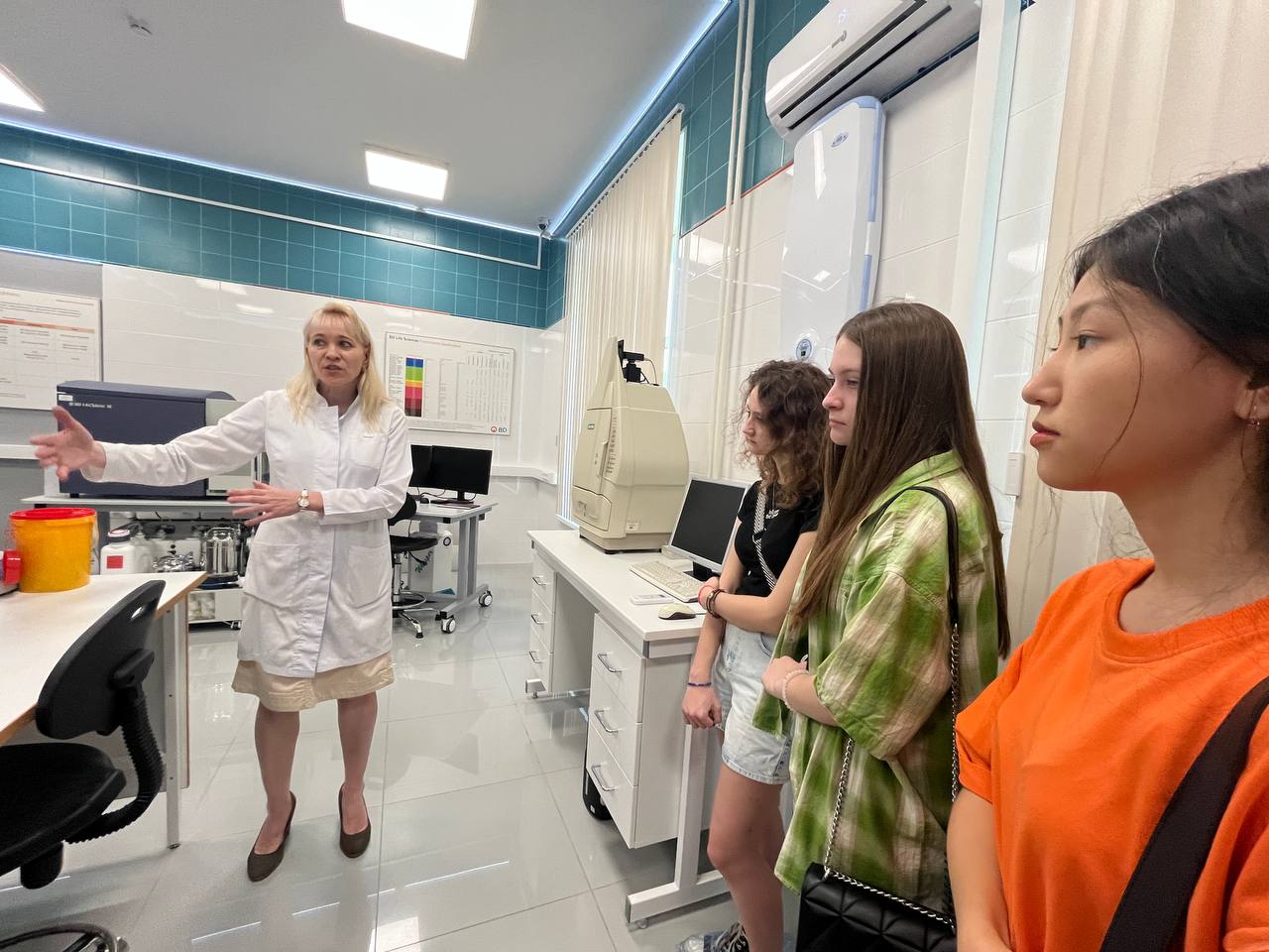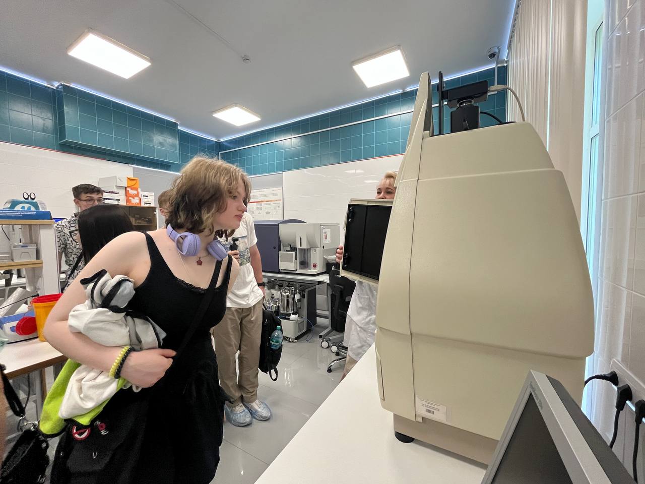Руководитель Центра биомедицинских и аддитивных технологий Татьяна Астрелина рассказала школьникам обо всех проводимых исследованиях. Среди рассмотренного оборудования самые современные приборы: 3D-биопринтер, проточный цитофлуорометр, комплекс прижизненной микроскопии клеток.