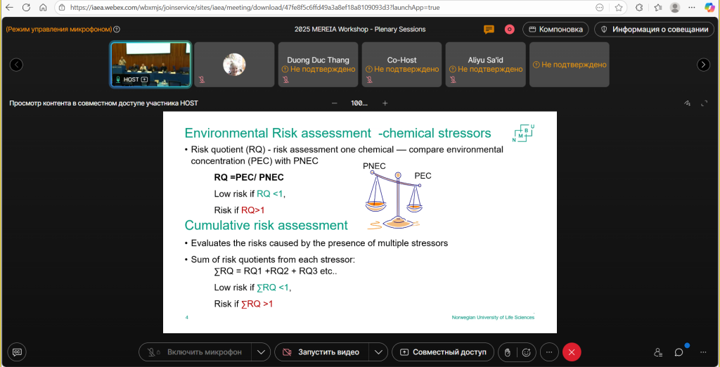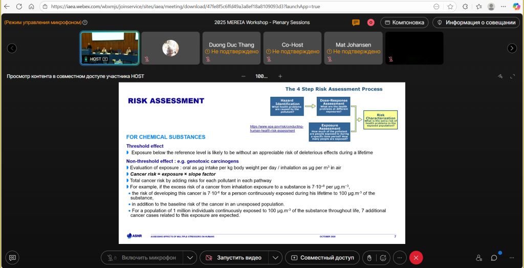 Ведущий научный сотрудник Проскурякова Наталья Леонидовна и молодой ученый Управления радиационной гигиены Центра Максимова Полина приняли участие во втором учебном семинаре-практикуме МАГАТЭ по методам оценки радиологического и экологического воздействия (МЕРЕИА), который проходил в виртуальном формате с 13 по 17 октября 2025 года.