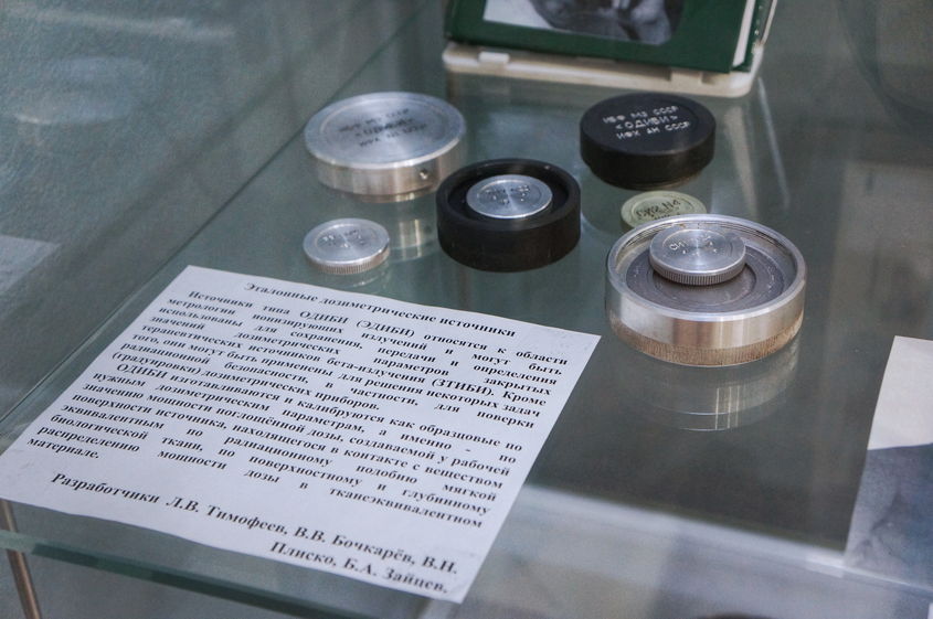 Следующий раздел второго зала посвящен деятельности одного из самых первых отделов Института – отдела радиофармпрепаратов и источников излучения. Именно здесь были разработаны первые радиофармпрепараты и источники излучения для лечения и диагностики сложнейших заболеваний. На витрине показаны офтальмоаппликаторы, разработанные для лечения онкологии глаза, генераторы рения и галлия, реагенты для изготовления радиофарпрепаратов. Результаты исследований представлены в монографиях и печатных трудах ученых отдела.